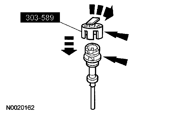 Install the special tool on the camshaft synchronizer by rotating the tool until it engages the notch in the camshaft synchronizer housing.