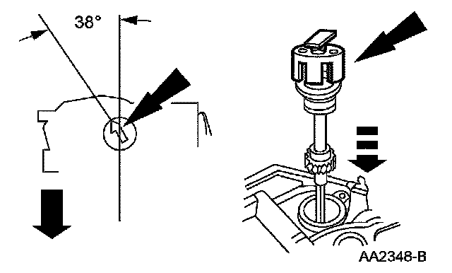 Install the camshaft synchronizer housing assembly so the arrow on the synchronizer alignment tool is 38 degrees from the centerline of the engine.