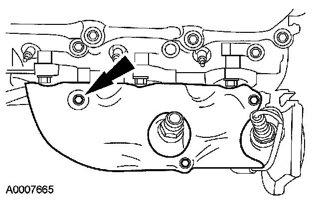 45. Install the RH exhaust manifold heat shield and the 3 bolts.