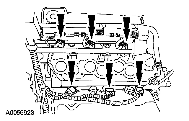 51. Position the engine control sensor wiring harness onto the engine and attach the wiring harness retainers onto the valve cover studs.