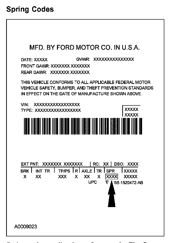 Spring codes are listed as a 2-part code. The first set of characters identify the front springs. The second set of characters identify the rear springs.