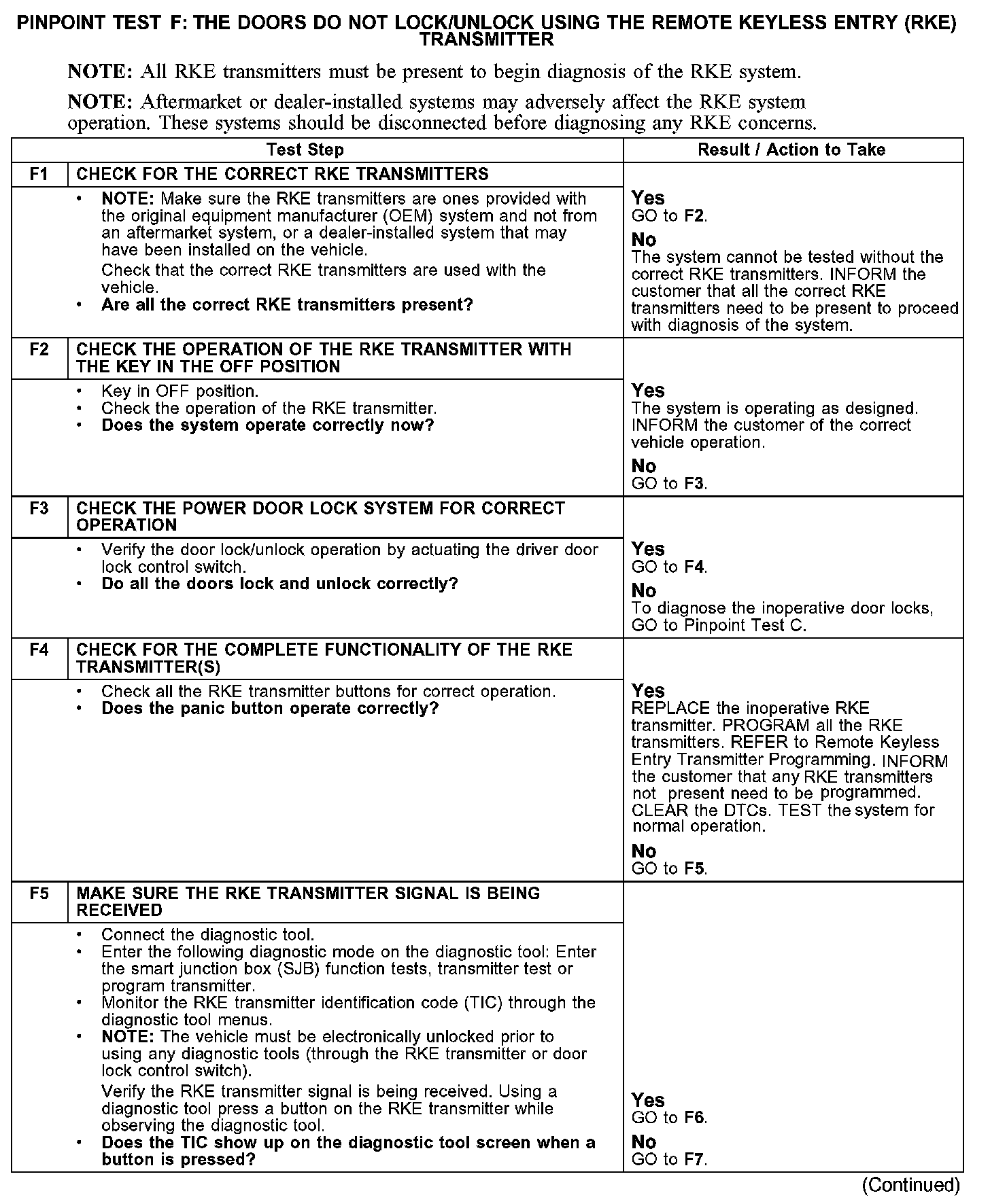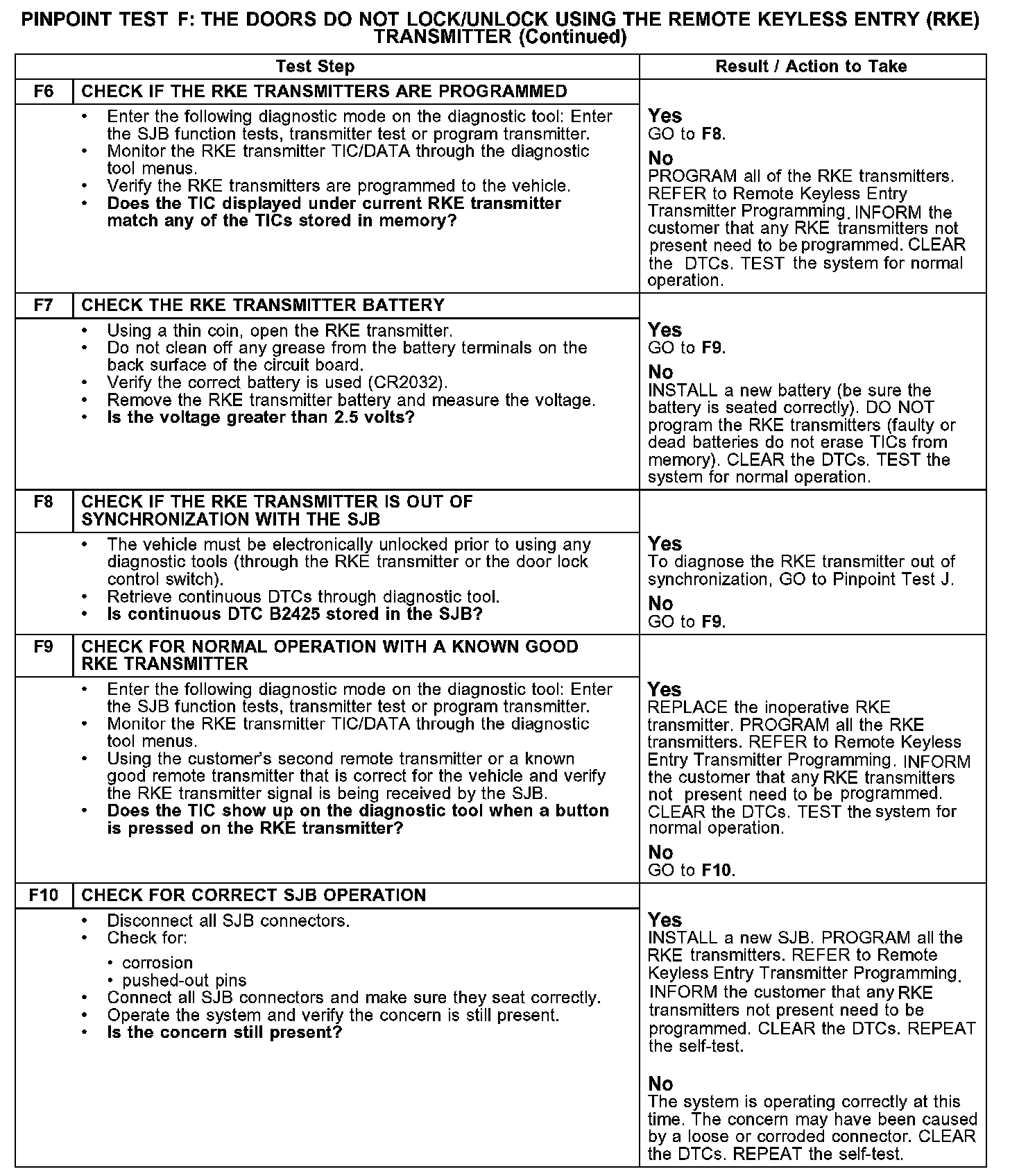 PINPOINT TEST F: THE DOORS DO NOT LOCK/UNLOCK USING THE REMOTE KEYLESS ENTRY (RKE) TRANSMITTERF1-F5: