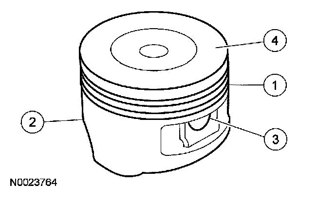 1. Clean and inspect the (1) ring lands, (2) skirts, (3) pin bosses and the (4) tops of the pistons. If wear marks, scores or glazing is found on the piston skirt, check for a bent or twisted connecting rod.
