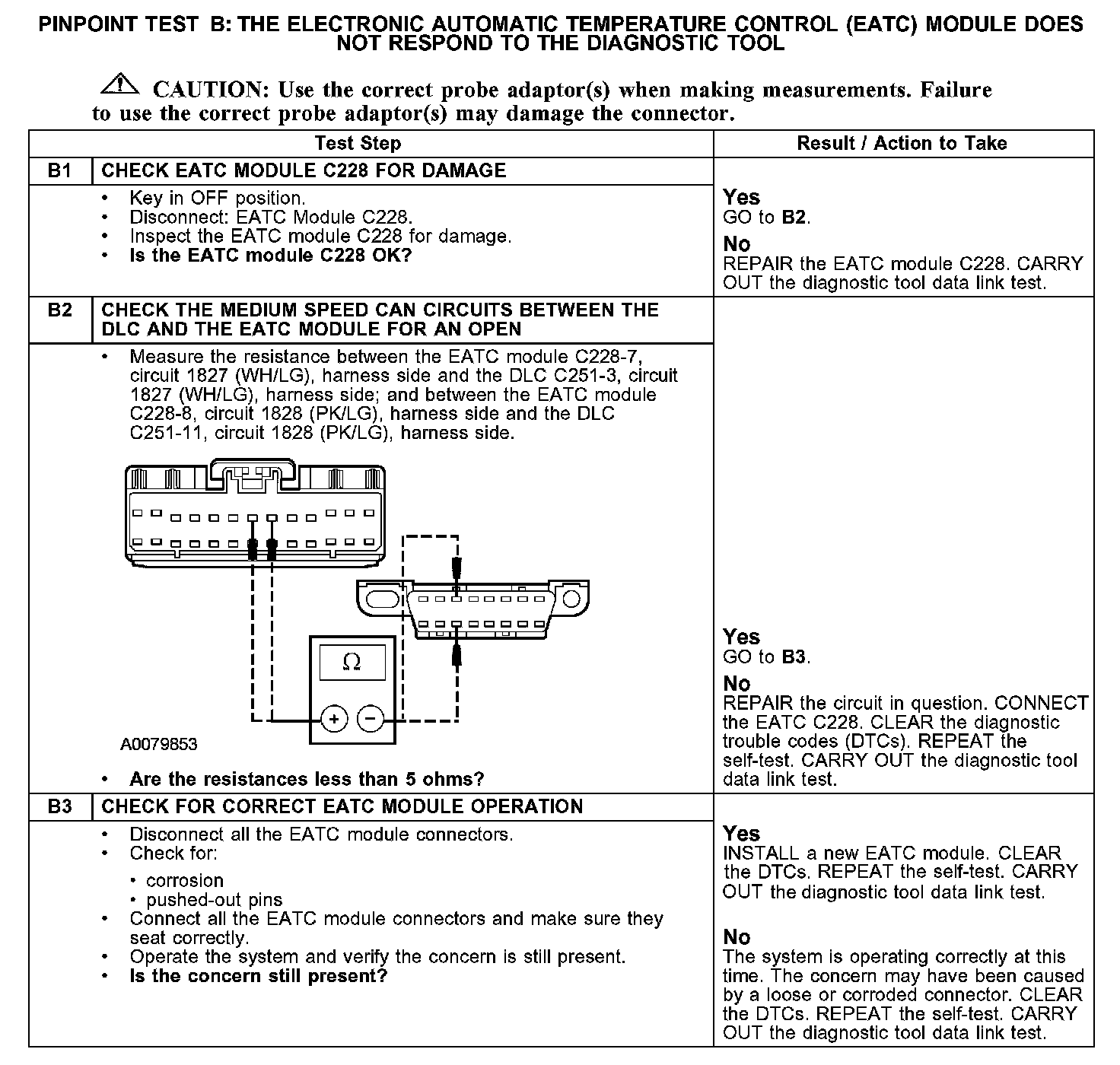 The EATC module communicates with the diagnostic tool through the medium speed controller area network (CAN), circuits 1827 (WH/LG) and 1828 (PK/LG). Check circuits 1827 (WH/LG) and 1828 (PK/LG) between the EATC module C228 and the data link connector (DLC) C251. The total resistance values must not be more than 5 ohms. If the resistance is more than 5 ohms there is an open in one of the medium speed CAN circuits, damage to the DLC C251, damage to the EATC module C228, or a problem in an in-line connector.