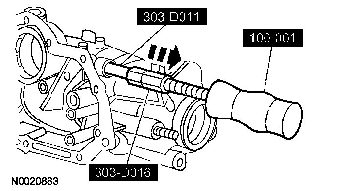Position the special tool into the case and install the hook end of tool into one of the lube holes in the front sun shell. Position the block over the edge of the assembly and tighten the handle.
