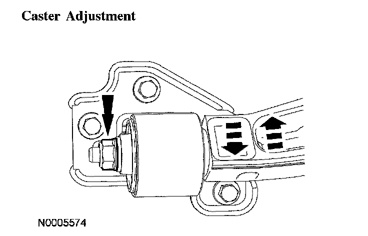 Caster is adjusted by loosening the lower arm rearward pivot bushing nut and moving the arm inward or outward. When adjusting the LH caster, a centering washer must be removed and discarded prior to adjusting.