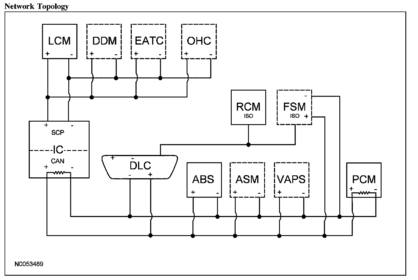 The SCP network has an unshielded twisted pair cable, data bus (+) and data bus (-) circuits. In addition to scan tool communication, this network allows sharing of information between all modules on the network.