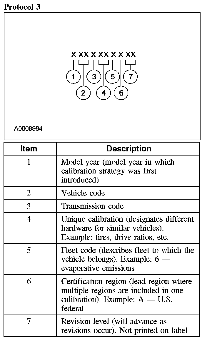 Powertrain calibration information is printed in the lower right corner of the Vehicle Certification Label. Only the base calibration information is printed. Revision levels will not appear, however, they can be found in On Line Automotive Service Information System (OASIS). For the current model year, Ford Motor Company is using 3 different protocols which describe powertrain base calibration. These Protocols are designed to provide worldwide standardization for vehicle calibration. If the electronic calibration strategy has been used since 1998 and carried into the current model year, Protocol 1 will be used. Refer to Protocol 1. If the electronic calibration strategy has been used since 1999 and is carried into the current model year, Protocol 2 will be used. Refer to Protocol 2. For electronic calibration strategies introduced since the 2001 model year, Protocol 3 will be used. Refer to Protocol 3.