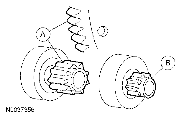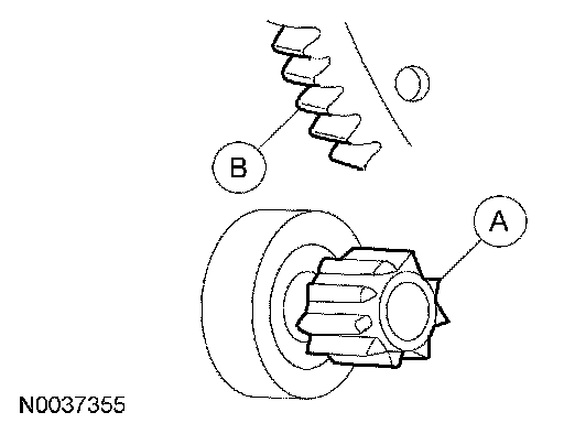 If the (A) starter drive gear and the flywheel ring gear are not fully meshing or the gears are (B) milled or damaged, install a new starter motor. Install a new flywheel ring gear.
