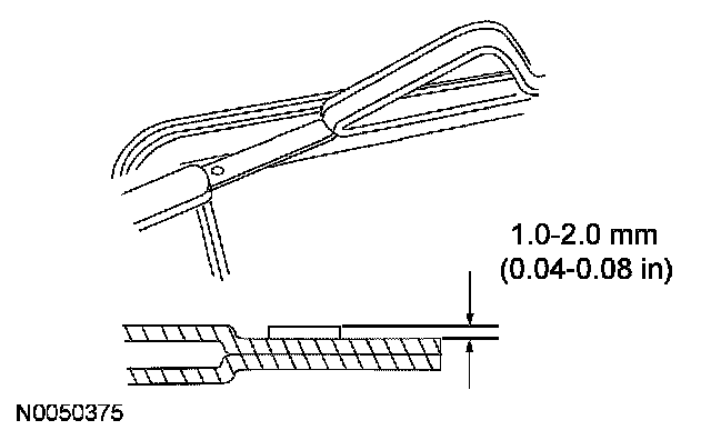 Using an appropriate tool, trim the urethane adhesive leaving a 1-2 mm (0.04-0.08 in) base of original equipment urethane on the pinch weld.