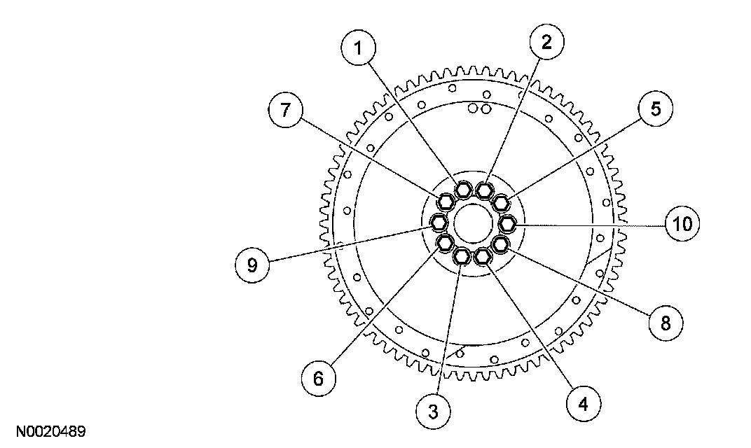 7. Position the flywheel and tighten the new bolts in 2 stages, in the sequence shown.
