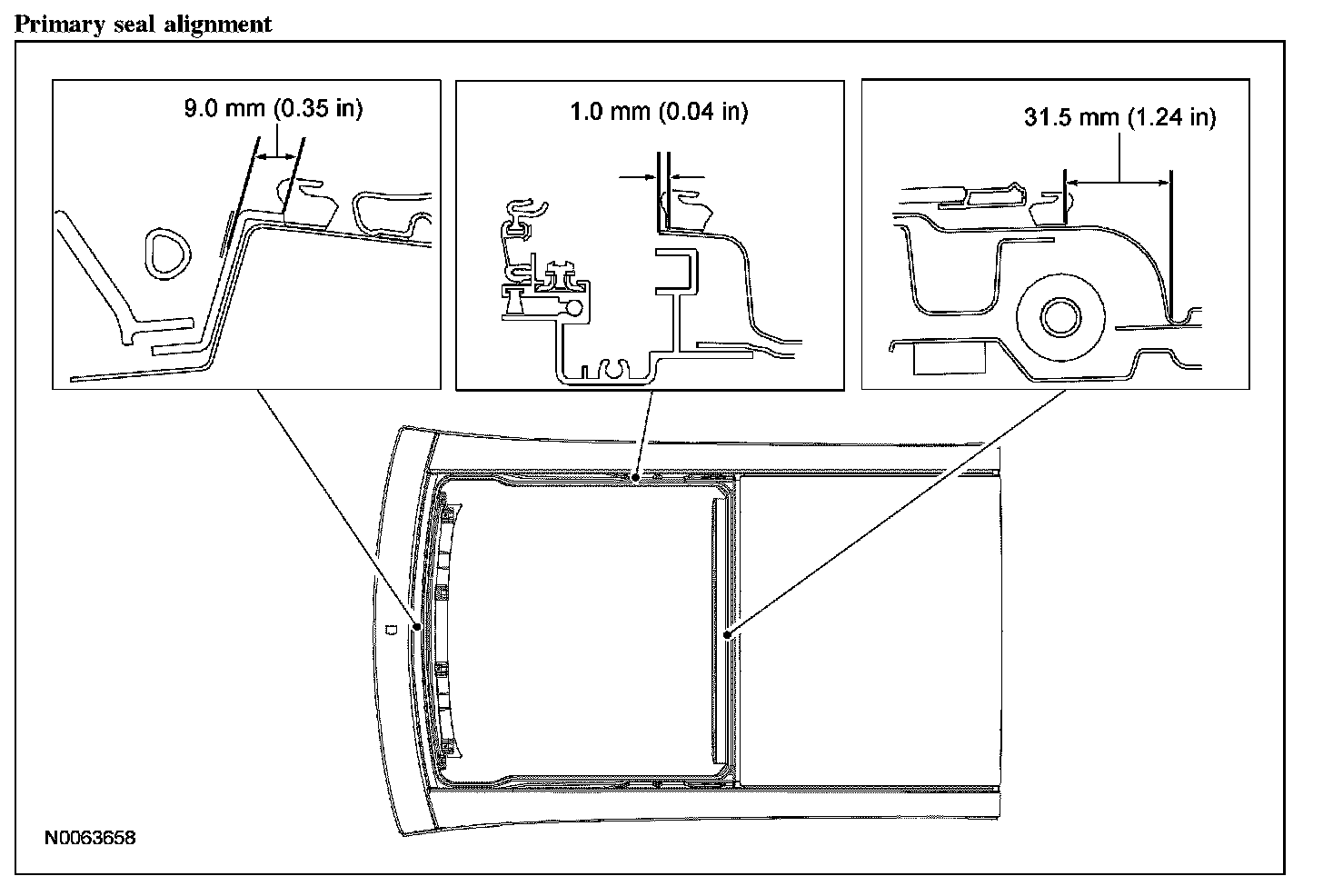2. NOTE: When the roof opening sliding glass panel is in the VENT position, the roof opening panel primary seal should contact the leading edge of the sliding glass.