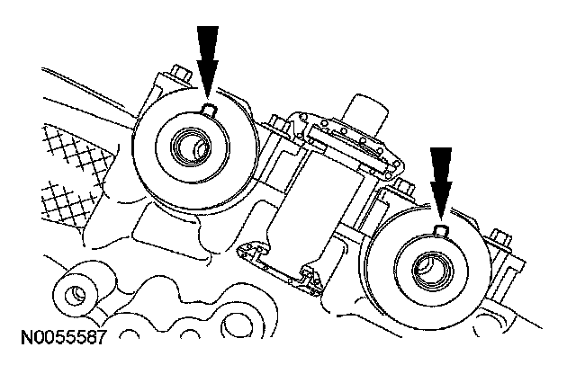 86. Rotate the crankshaft clockwise and align the timing marks on the VCT assemblies as shown.