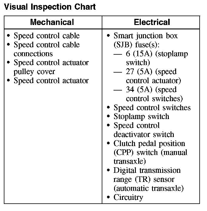 INSPECTION AND VERIFICATIONNOTE: If any concerns are noted with the speedometer, stoplamps or horn, address those concerns by referring to their associated sections before continuing the speed control diagnosis.