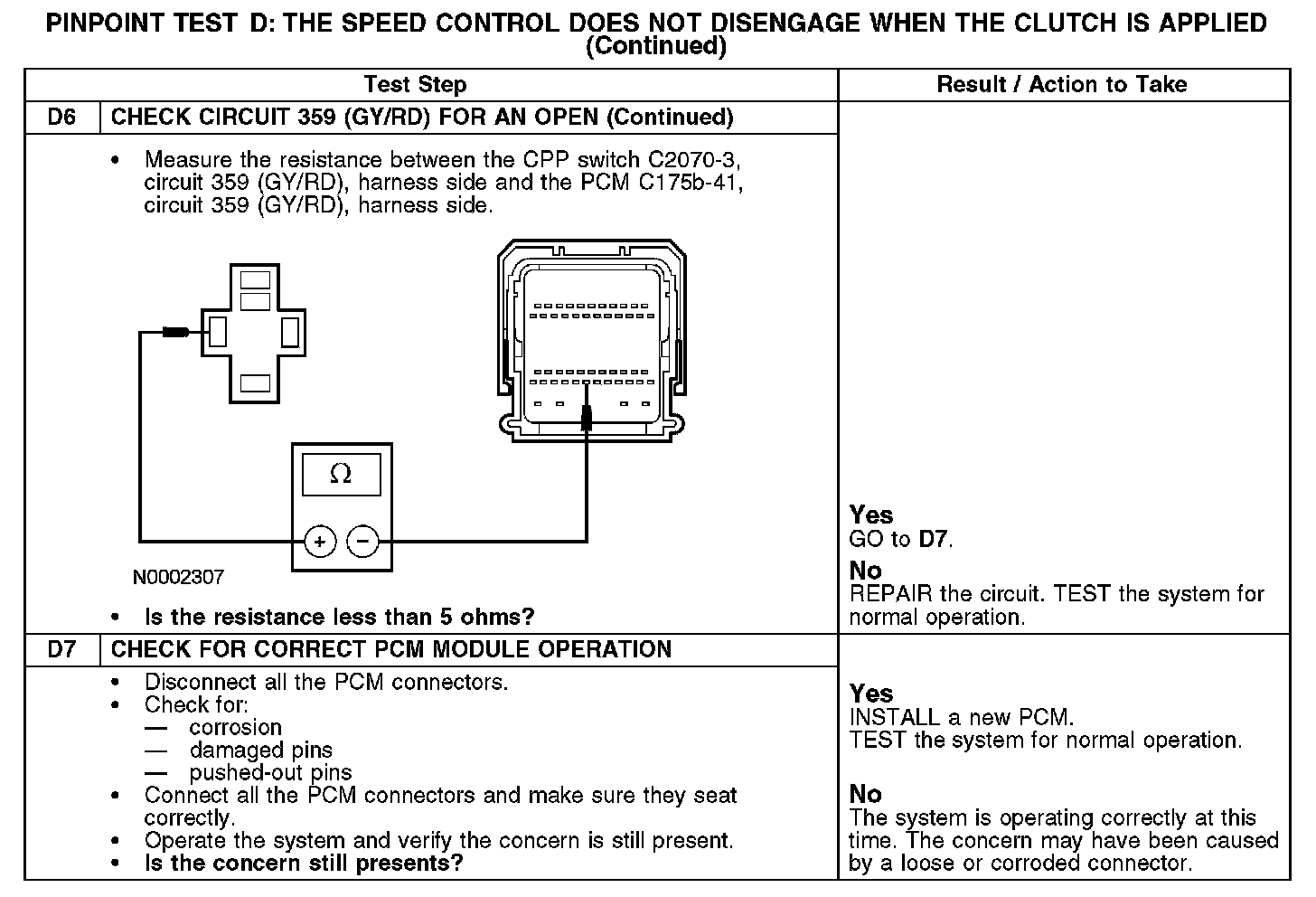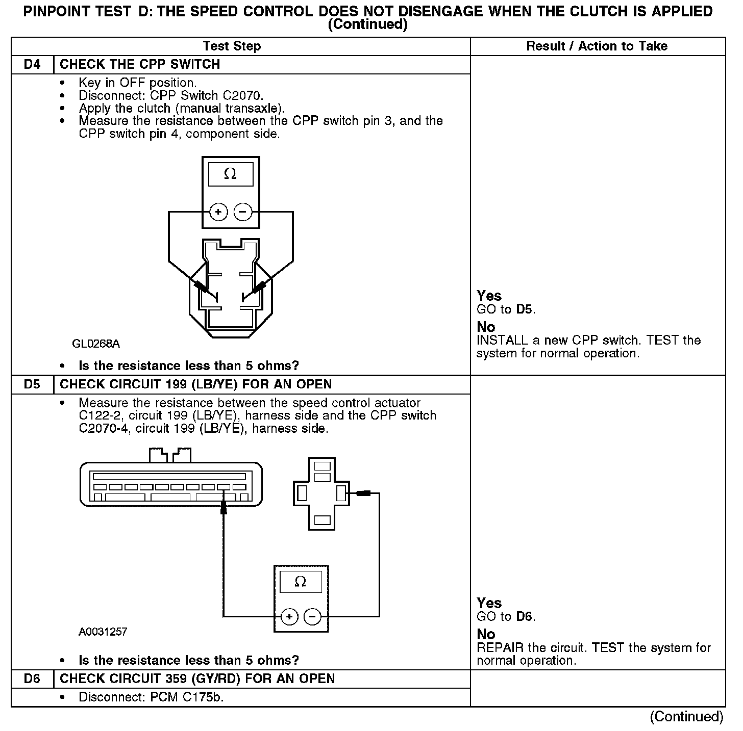 The speed control actuator sends a voltage reference signal through circuit 199 (LB/YE). When the clutch is applied, the clutch pedal position (CPP) switch closes and routes the signal to ground through circuit 359 (GY/RD). Ground is supplied by the powertrain control module (PCM).