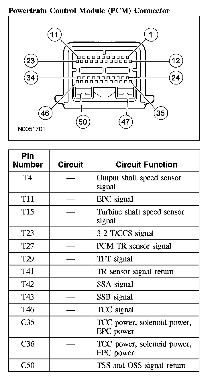 Transaxle Connector LayoutsNOTE: This vehicle is equipped with a new style powertrain control module. This is a 50-pin control module with 3 separate connectors. One connector for the chassis (C), one for the transaxle (T) and one for the body (B). The pin numbers listed throughout these pinpoint tests will have the letter C and T to designate the connector.