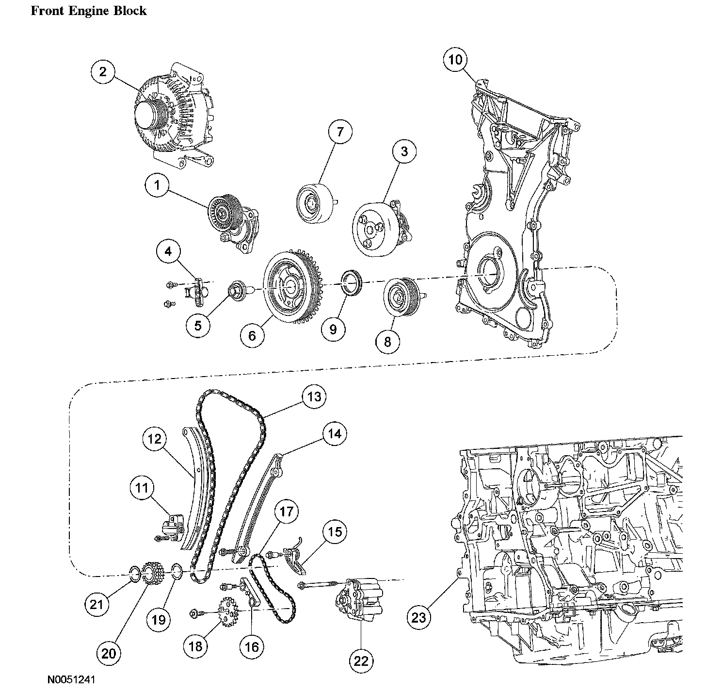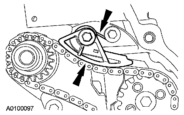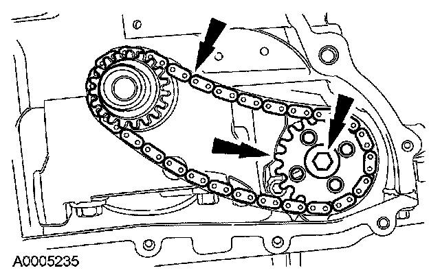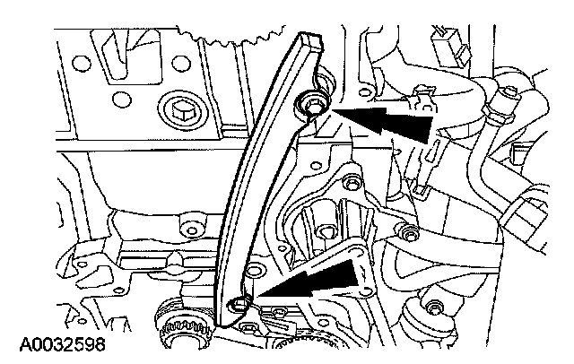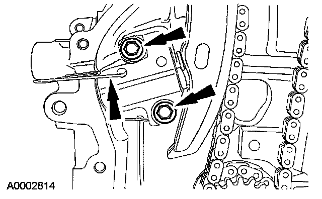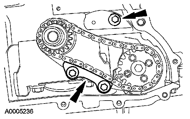 NOTE: Early build engines are equipped with an oil pump chain guide. Late build engines do not have an oil pump chain guide. Also, late build engines use an updated design for the oil pump drive chain and tensioner. Therefore, the oil pump drive components are not interchangeable between early and late build engines.