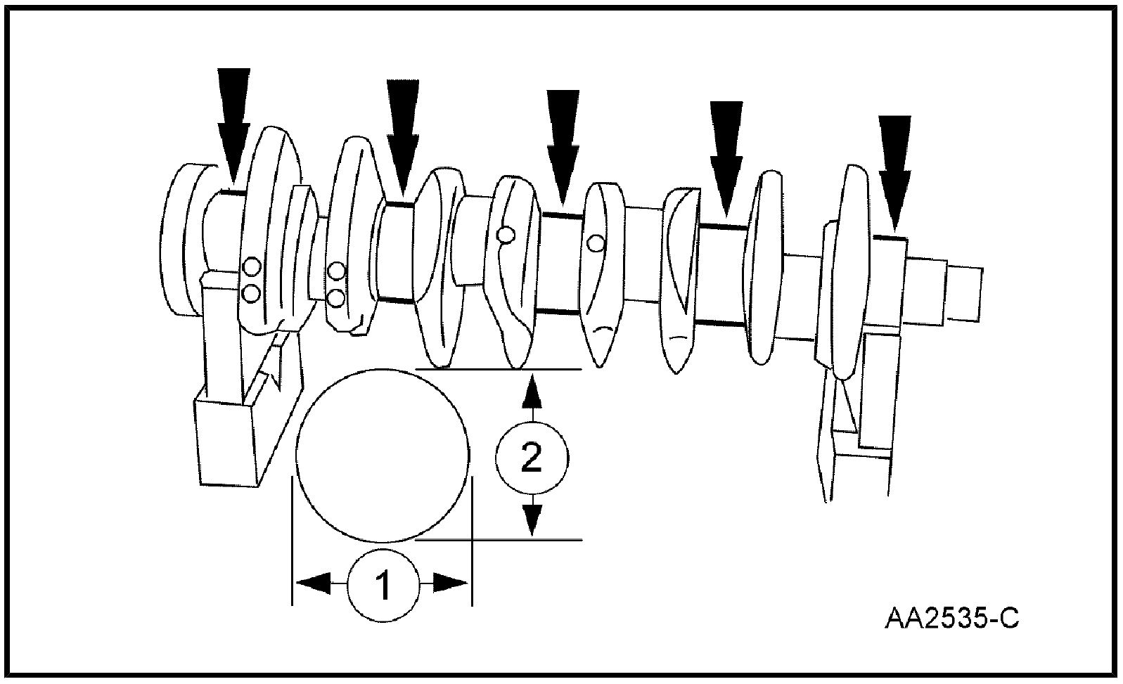 2. Measure each of the crankshaft main bearing journal diameters in at least 2 directions and record the smallest diameter for each journal.