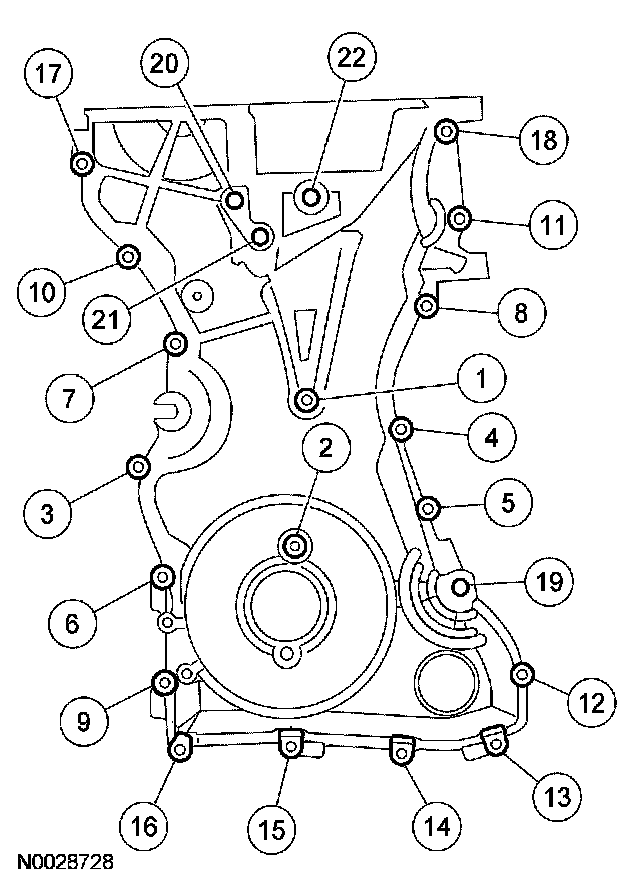 65. Install the engine front cover. Tighten the bolts in the sequence shown, to these specifications: