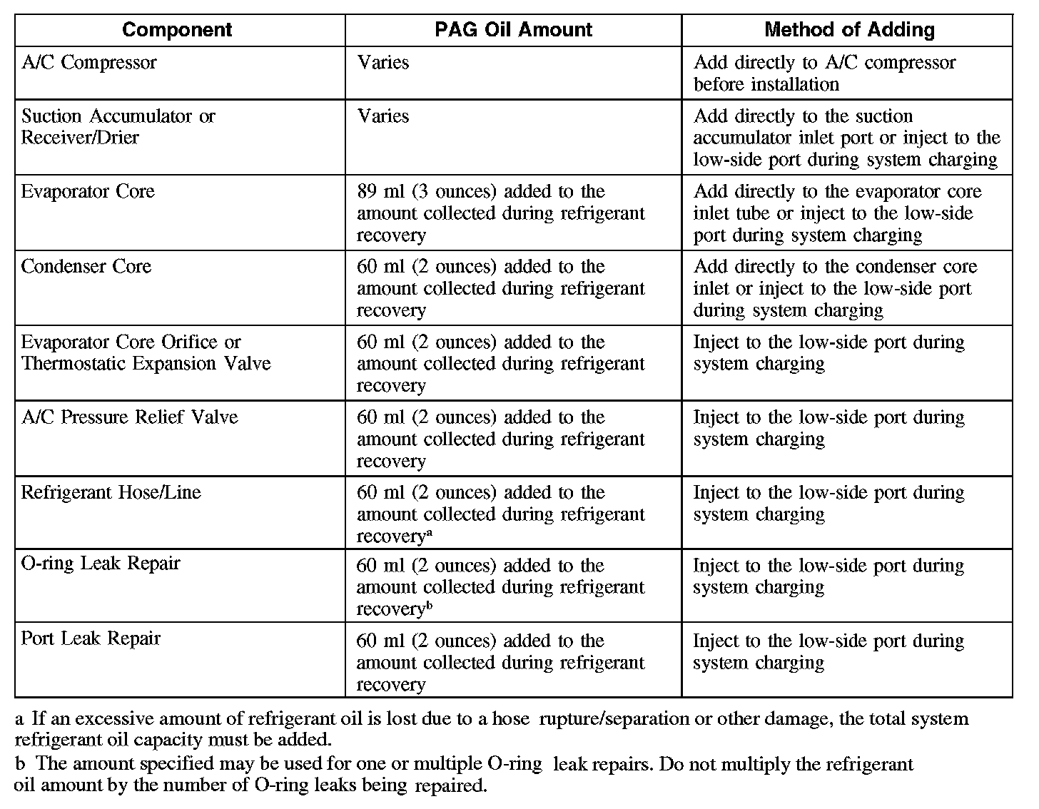 CAUTION: During normal A/C operation, oil is circulated through the system with the refrigerant, and a small amount is retained in each component. If certain components of the system are removed, some of the refrigerant oil will go with the component. To maintain the original total oil charge, it is necessary to compensate for the oil lost by adding oil to the system with the new part.