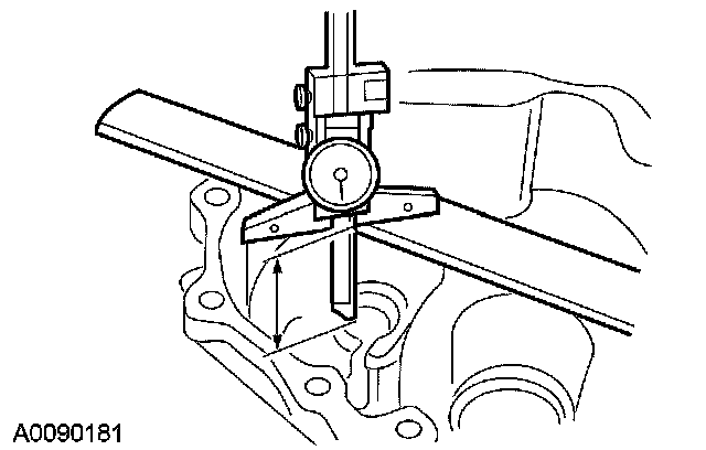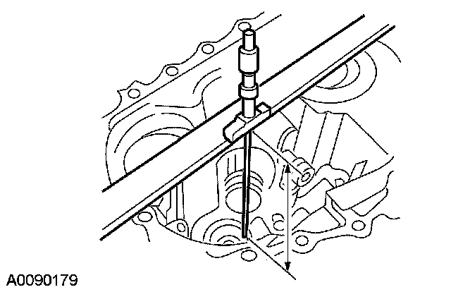 54. Using a depth micrometer and a straight edge, measure and record the depth from the mating surface of the clutch housing to the reverse idler shaft bearing surface. Record this measurement as L2.