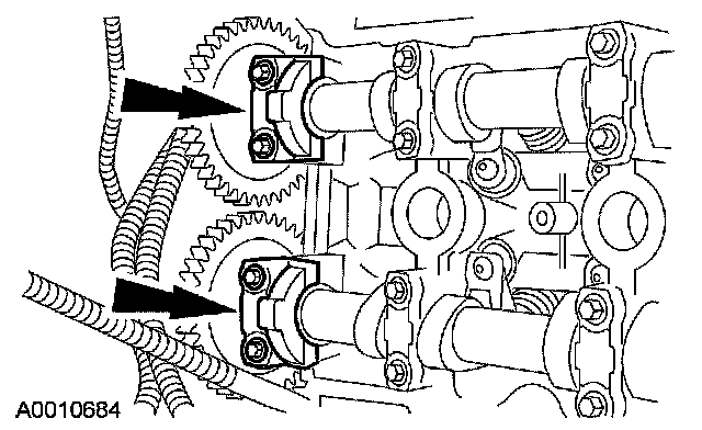 27. Lubricate the bearing surfaces of the LH camshaft bearing thrust caps with clean engine oil and install the bearing thrust caps.