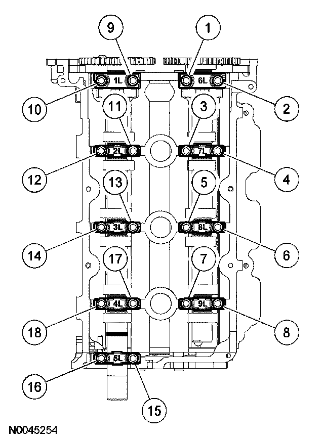 Lubricate the bearing surfaces of the LH camshaft bearing caps with clean engine oil and install the bearing caps.