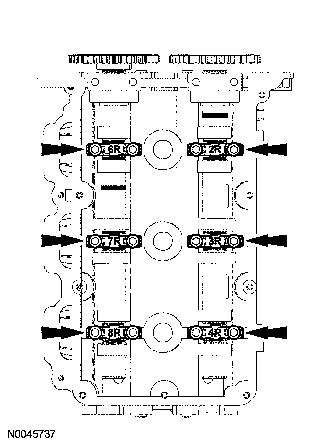 30. Lubricate the bearing surfaces of the RH camshaft bearing thrust caps with clean engine oil and install the bearing thrust caps.