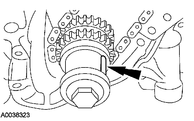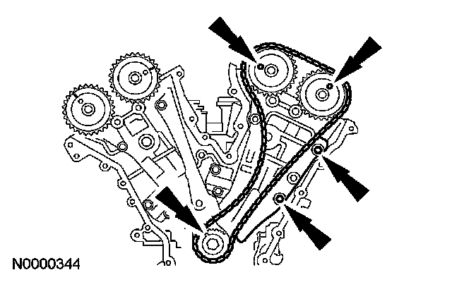 ^ Align the marks on the timing chain with the marks on the camshaft and crankshaft sprockets.