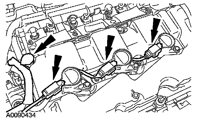 17. Disconnect the LH coil-on-plug electrical connectors and detach the wiring retainers.