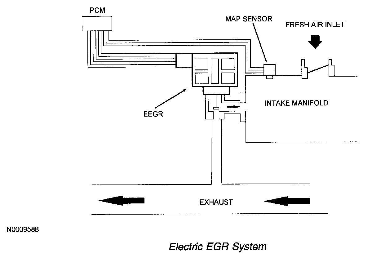 The EEGR system consists of an electric motor/EGR valve integrated assembly, the powertrain control module (PCM), and the connecting wiring. Additionally a MAP sensor is also required. Operation of the system is as follows: