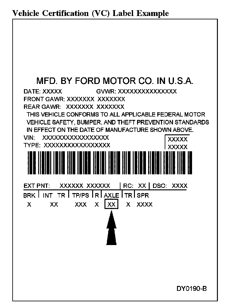 The Vehicle Certification (VC) label is located in the driver door jamb. The axle code is on the VC label.
