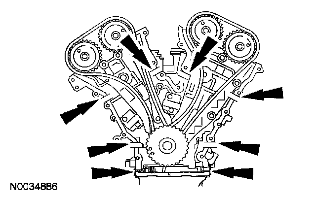 CAUTION: During engine repair procedures, cleanliness is extremely important. Any foreign material, including any material created while cleaning gasket surfaces that enters the oil passages, coolant passages or the oil pan, can cause engine failure.