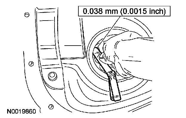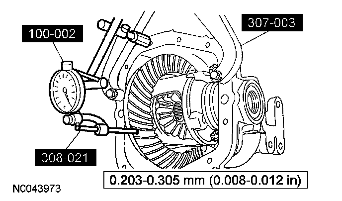5. Using the special tool, measure and record the differential ring gear backlash between teeth in 4 equally spaced places around the ring gear.