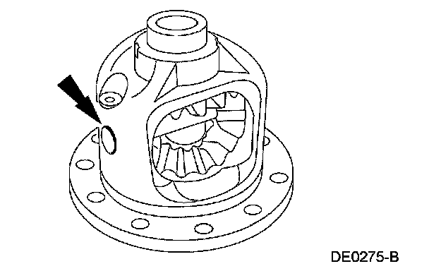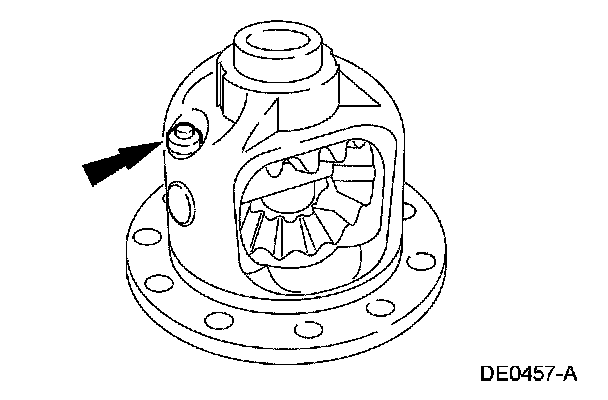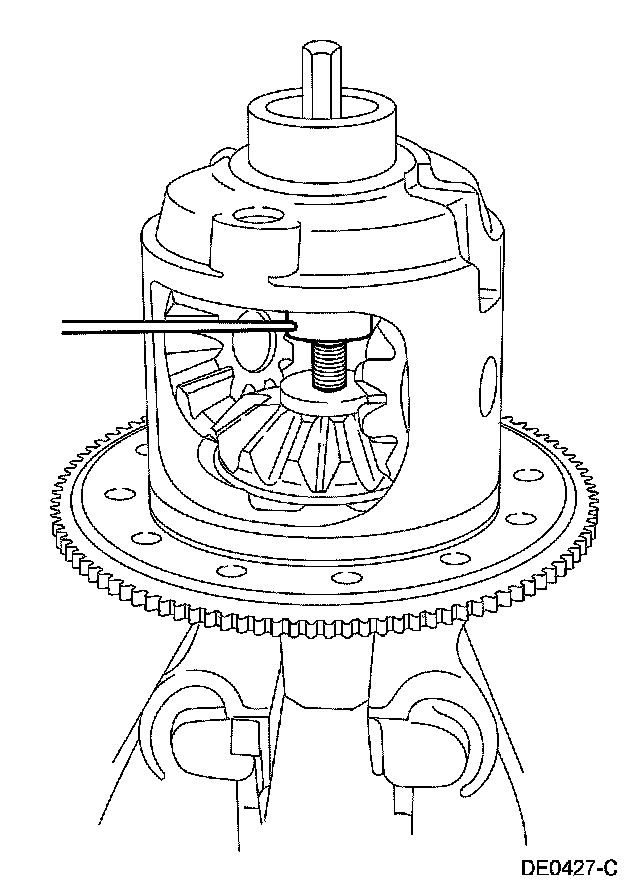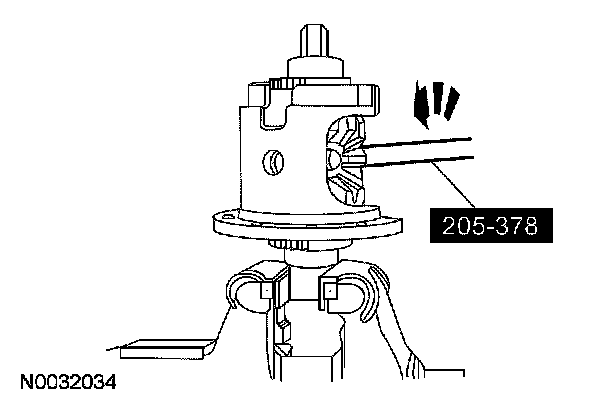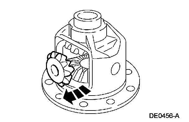 Insert the special tool into the pinion shaft bore and turn the differential case. This will move the differential side gears and position them in the differential case. Rotate the differential case until the pinion mating shaft holes are aligned with the differential pinion gears.