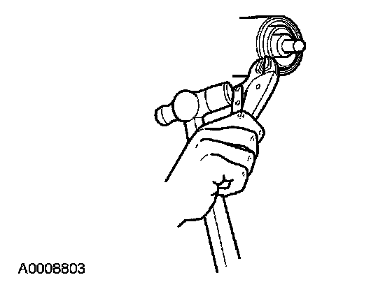 34. Force up on the metal flange of the drive pinion seal. Install gripping pliers and strike with a hammer until the pinion seal is removed.