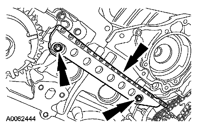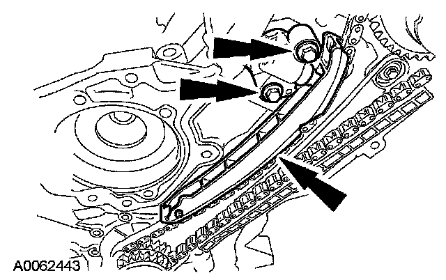 10. Remove the bolts, the LH timing chain tensioner and tensioner arm.