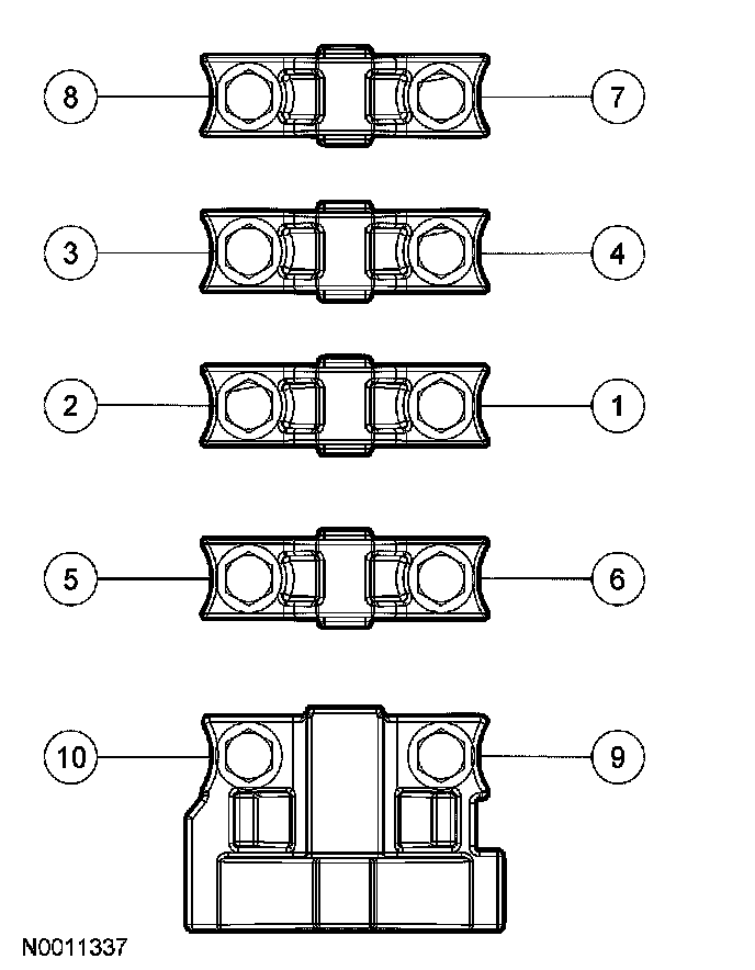 Remove the bolts in the sequence shown and remove the LH cylinder head front camshaft bearing cap and then the remaining bearing caps.