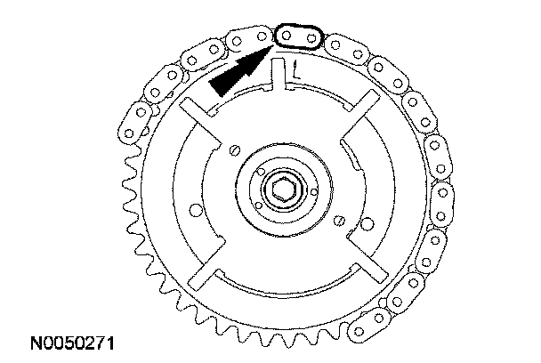 Position the LH timing chain on the camshaft sprocket. Make sure the camshaft sprocket timing mark is aligned with the copper (marked) chain link.