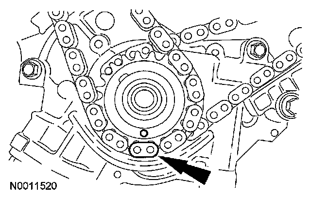 13. Position the lower end of the LH (inner) timing chain on the crankshaft sprocket, aligning the timing mark on the outer flange of the crankshaft sprocket with the single copper (marked) link on the chain.