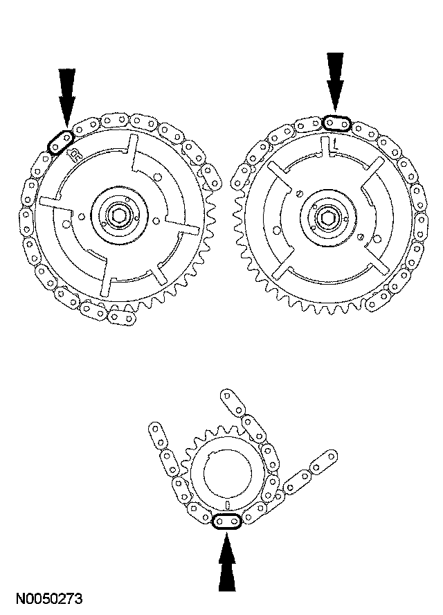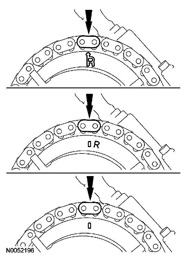 Position the RH timing chain on the camshaft sprocket. Make sure the camshaft sprocket timing mark is aligned with the copper (marked) chain link.