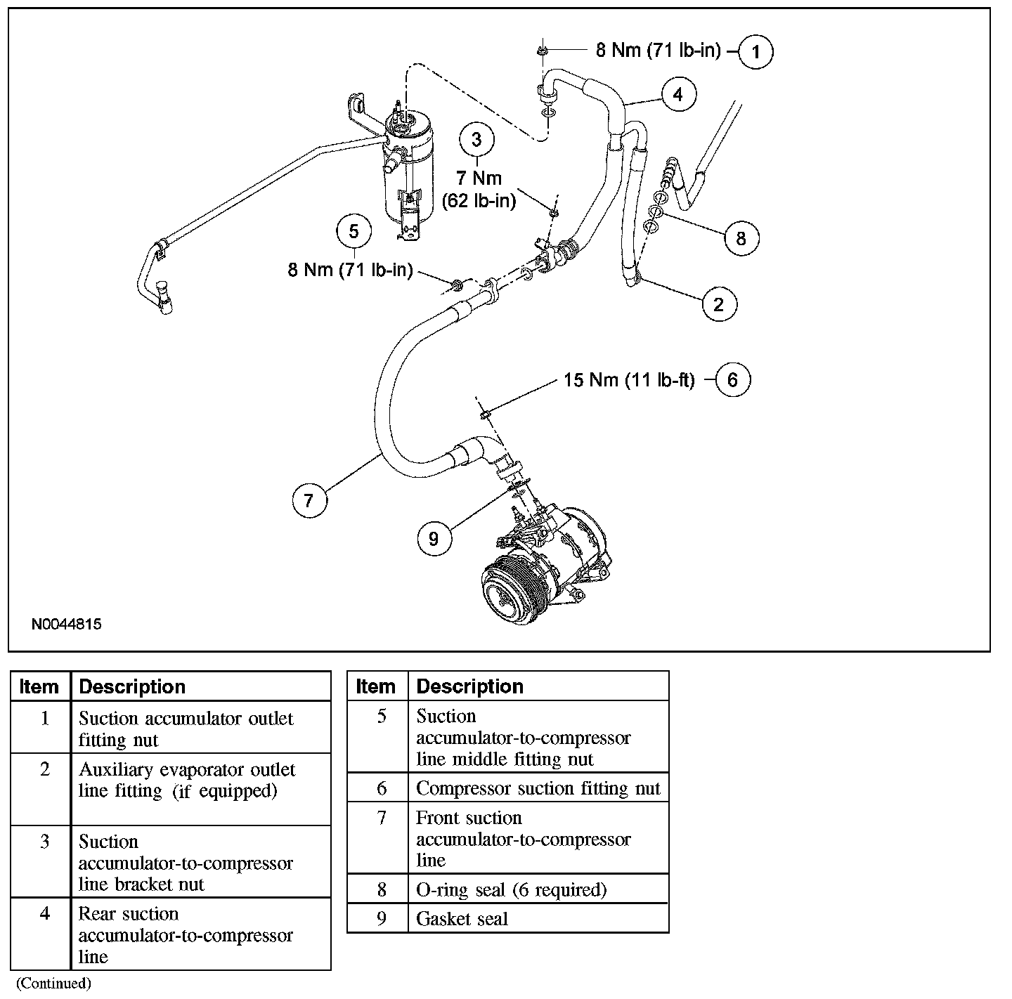 NOTE: Installation of a new suction accumulator is not required when repairing the air conditioning system, except when there is physical evidence of contamination from a failed A/C compressor or damage to the suction accumulator.