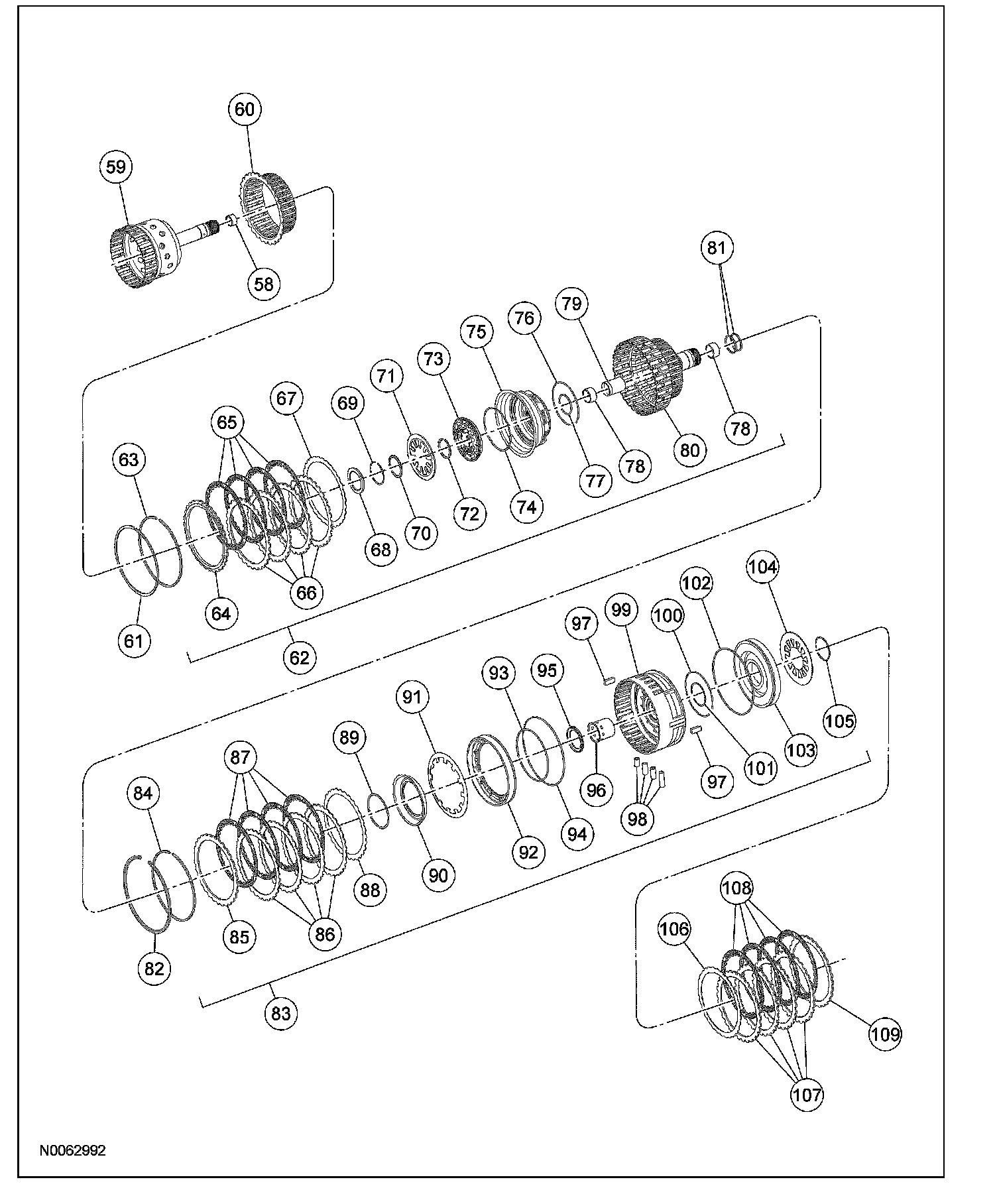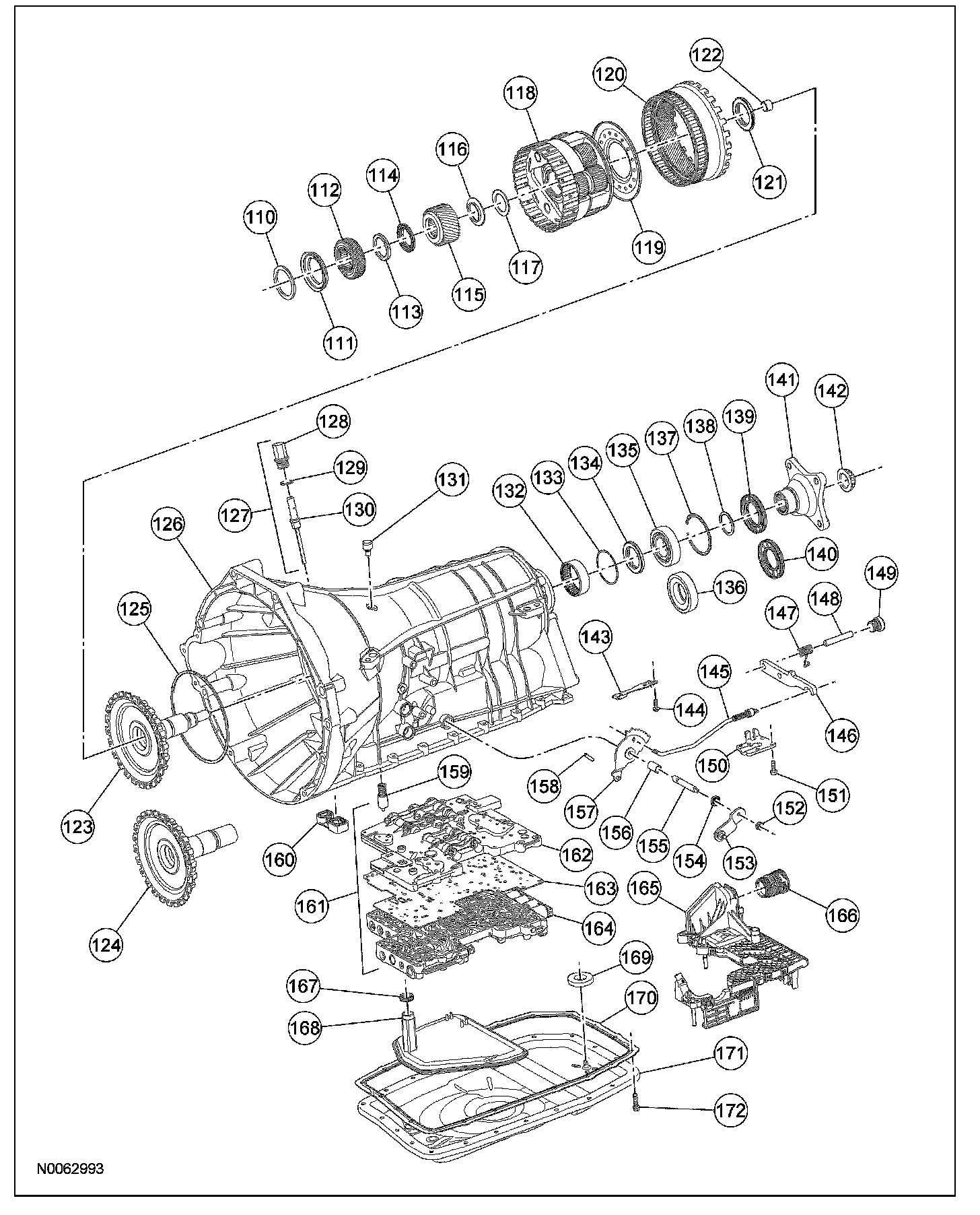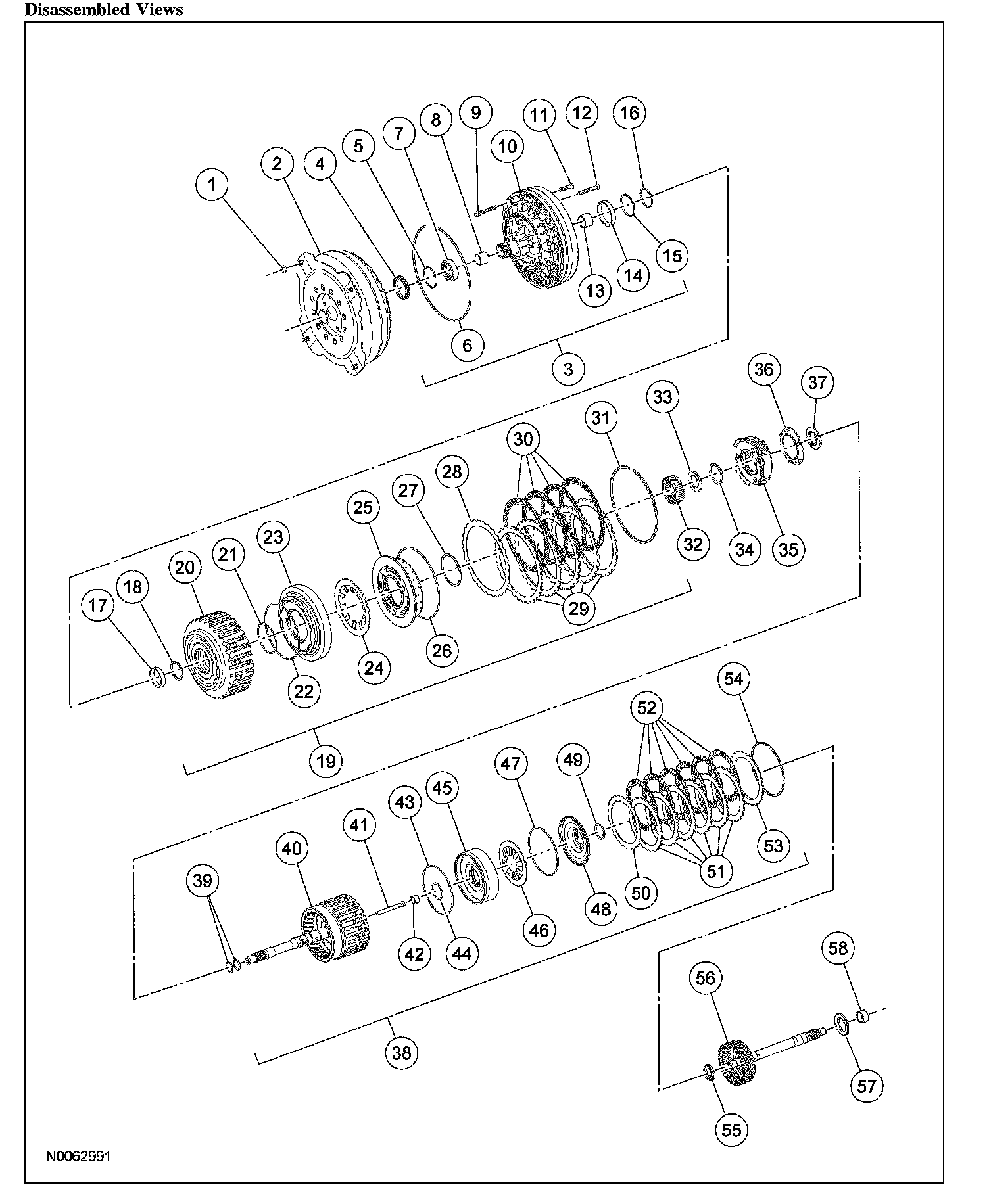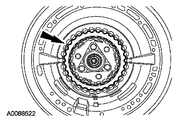 29. Install the low/reverse clutch plates, starting with the pressure plate and alternating between the friction and steel plates, and ending with the wave spring plate on the top.