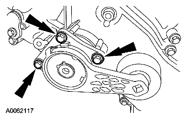 62. Position the accessory drive belt tensioner and install the 3 bolts.