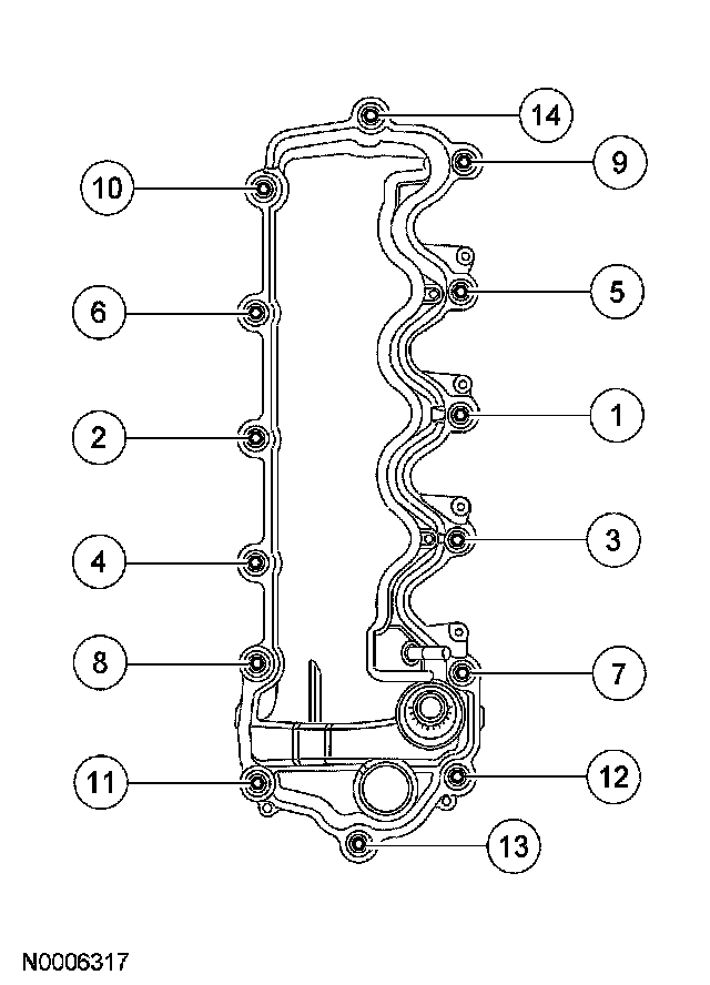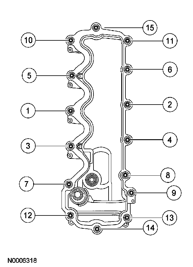 Position the LH valve cover and gasket on the cylinder head and tighten the 15 bolts in the sequence shown.