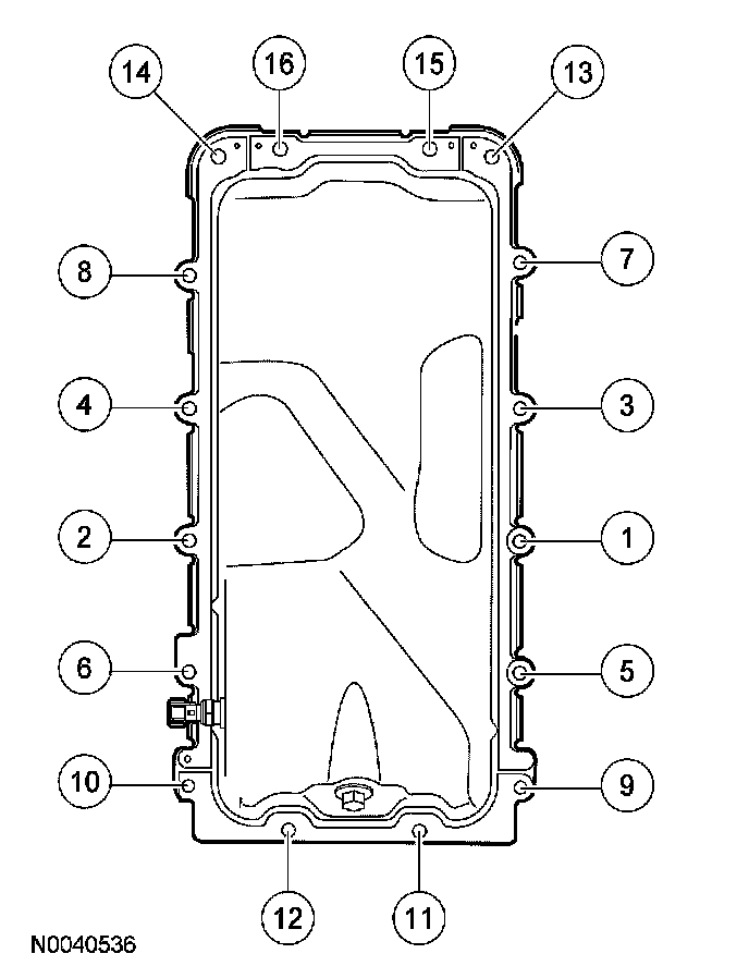 114. Install the oil pan gasket and the oil pan and loosely install the 16 bolts.
