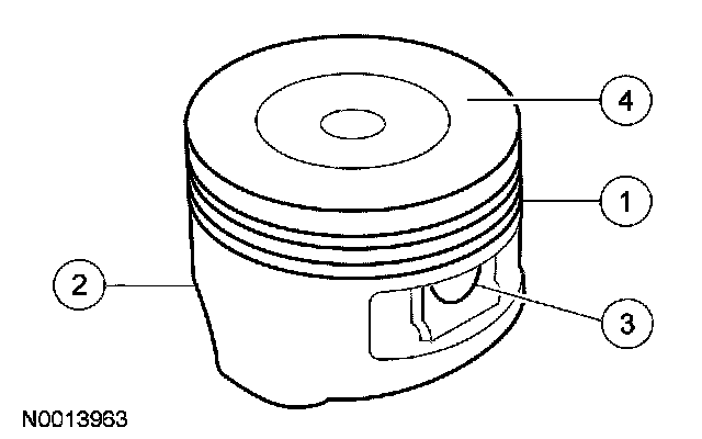 1. Clean and inspect the (1) ring lands, (2) skirts, (3) pin bosses and the (4) tops of the pistons. If wear marks, scores or glazing is found on the piston skirt, check for a bent or twisted connecting rod.