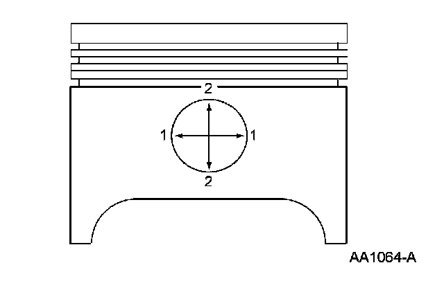 1. Measure the piston pin diameter in 2 directions at the points shown. Verify the diameter is within specification.