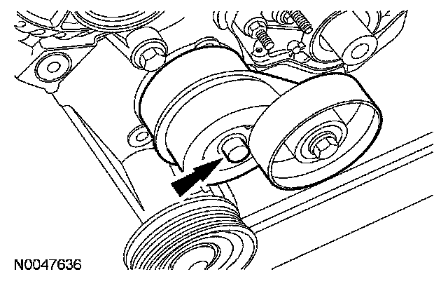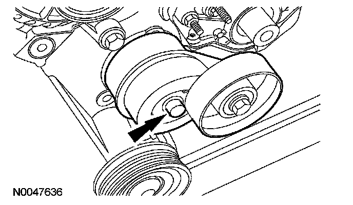 9. Remove the bolt and the accessory drive belt tensioner.