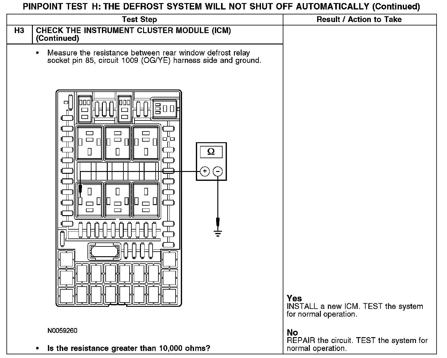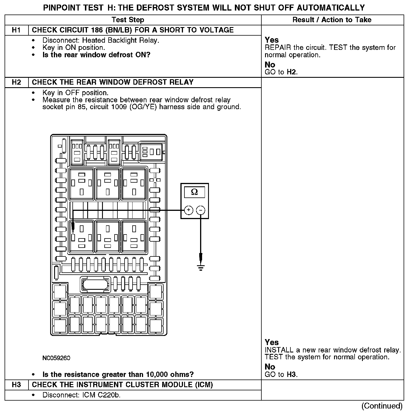 Under normal operation, the heated backlight relay receives power from circuit 1113 (YE/LG) and central junction box (CJB) fuse 10 (10A). When the rear window defrost switch is depressed on the temperature control module, a message is sent to the instrument cluster module (ICM) through the multiplex link system. Once the ICM receives the message to turn on the rear window defrost, the ICM grounds circuit 1009 (OG/YE) to activate the heated backlight relay. Power is then sent to the rear window defrost grid through circuit 186 (BN/LB) from the heated backlight relay. The rear window defrost grid then receives ground through circuit 57 (BK) to chassis ground.